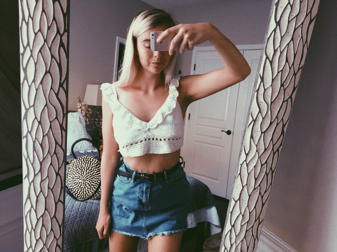This is definitely one of my favorite looks! I’m obsessed with this crop top & jean skirt! I like keeping colors simple and I prefer to not wear a lot of accessories but I thought the belt with it was really cute and flattering.